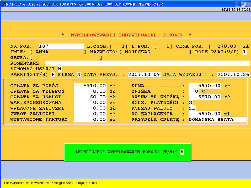 służy do rozliczenia oraz wymeldowania gości indywidualnych. Wybór wymeldowywanego pokoju recepcjonistka dokonuje poprzez wpisanie numeru pokoju w pole
