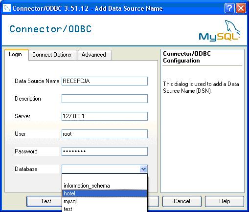 12.Wypełnić ekran konfiguracyjny sterownika ODBC 12.a Data Source Name: RECEPCJA (dowolna własna nazwa sterownika w/g której programy będą się łączyć z bazą danych) 12.b Server : adres IP serwera MySQL jeśli serwer jest zainstalowany na tym samym komputerze co i program adres ten jest równy [127.0.0.1]. 12.c User : nazwa użytkownika w naszym przypadku "root" oczywiście może być dowolnie inna utworzona na serwerze. 12.d Password : hasło użytkownika które zostało nadane podczas instalacji serwera MySQL. 12.e Database : w zakładce należy wybrać bazę danych z którą ma się połączyć program za pomocą konfigurowanego sterownika ODBC , w naszym przypadku "hotel". 13Jeśli serwer został zainstalowany według opcji standardowych tak jak to jest opisane w instrukcji zawartej na naszej stronie deklarowanie innych parametrów nie jest konieczne.Pełen opis deklaracji Serwera oraz sterowników ODBC znajduje się na fabrycznej stronie MySQL www.mysql.com.