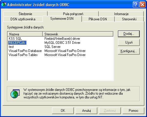 15.Po akceptacji pokaże się okno z zainstalowanymi sterownikami ODBC w systemie na naszym komputerze.W śród nich powinien pojawić się zainstalowany sterownik o nazwie RECEPCJA.Parametry konfiguracji należy wpisać do programu RECEPCJA podczas instalacji systemu.