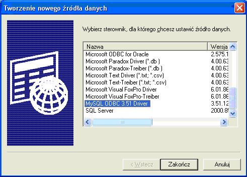 11.Z listy sterowników wybierz wcześniej zainstalowane sterowniki MySQL ODBC x.xx Drivers i naciśnij Zakończ